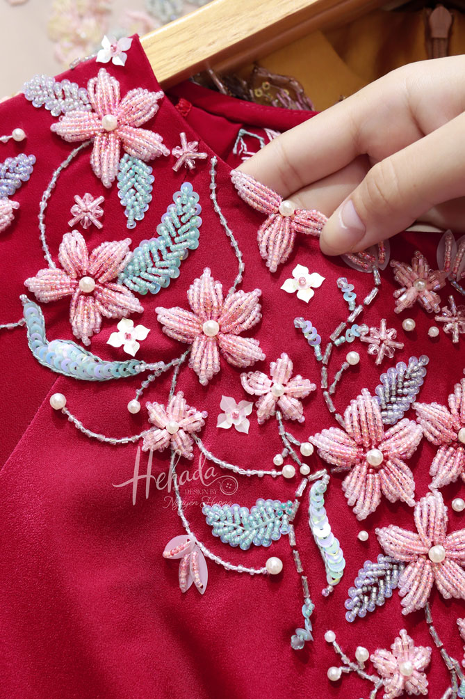 Phần cổ áo được đính kết hoạ tiết hoa nhẹ nhàng có độ chuyển màu bắt mắt, tạo nên sự hài hoà ví như tình yêu thương chu toàn của mẹ dành cho con