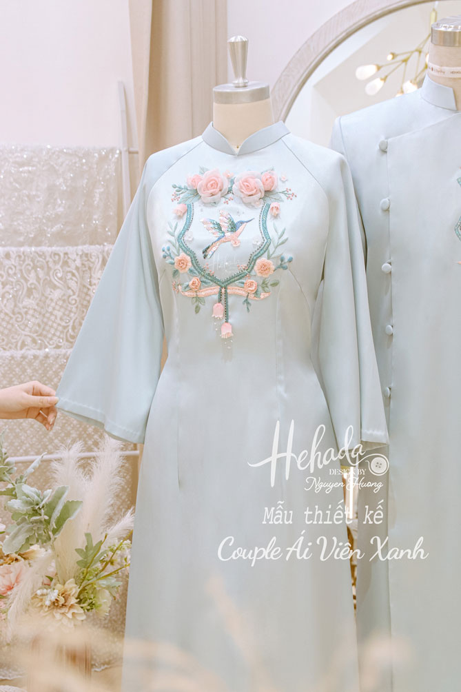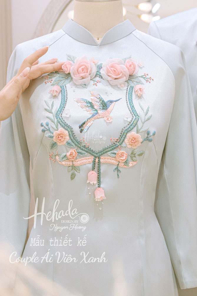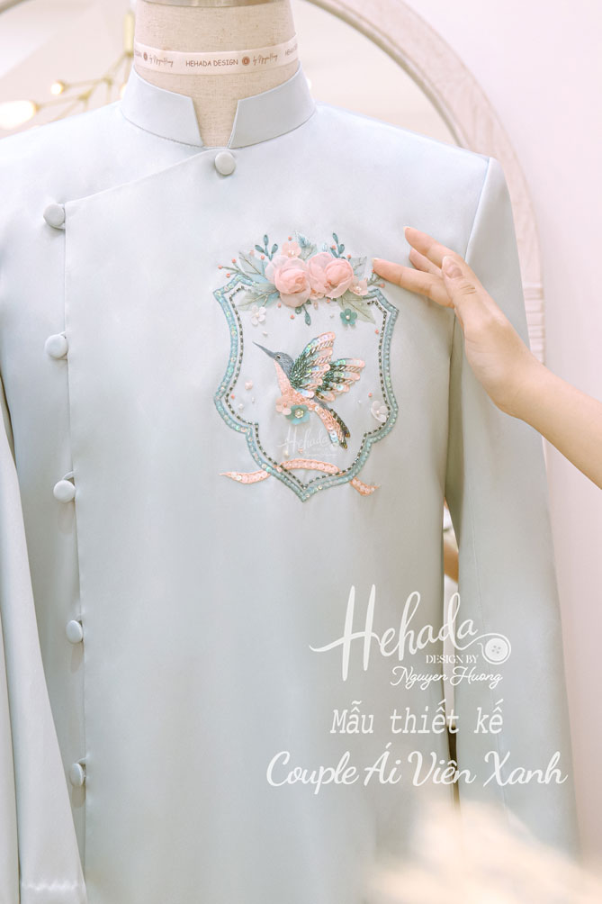 Couple Ái Viên Xanh với hoạ tiết chim xanh được thêu tay tinh xảo, bao quanh là những đoá hồng được He thiết kế thủ công nổi bật, mỗi đường kim mũi chỉ như lời chúc cho một khởi đầu hạnh phúc