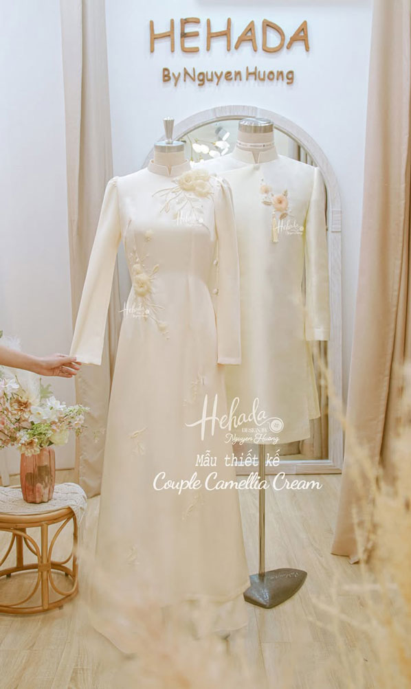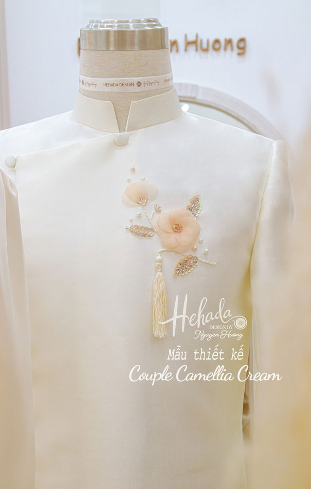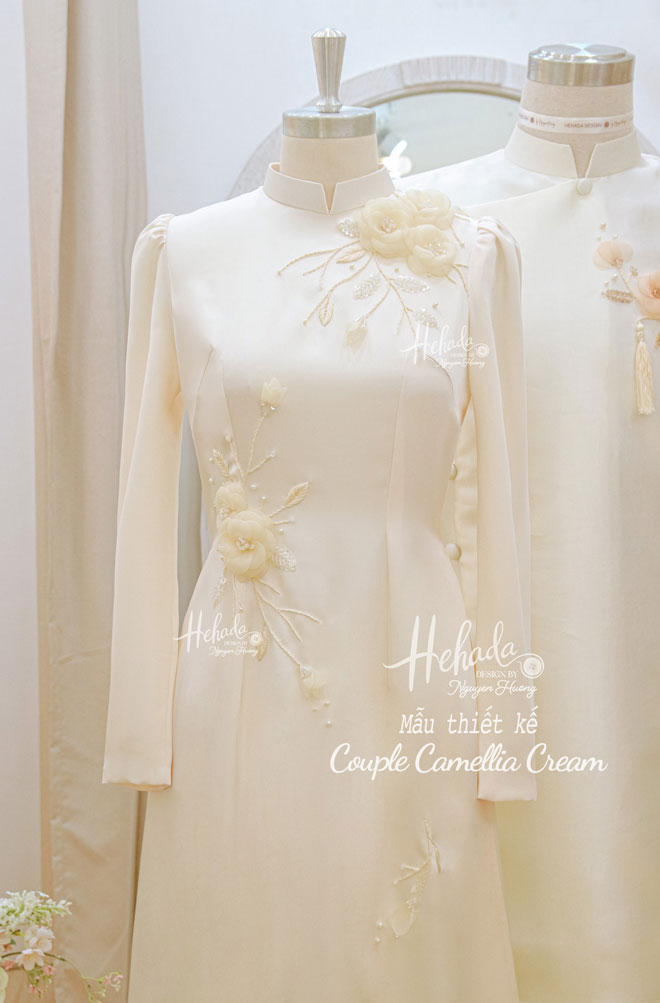 Hoạ tiết Camellia được He đính kết thủ công phối hoa voan cùng với cườm chuyển sắc đồng bộ với màu áo dài vừa tạo điểm nhấn nổi bật vừa uyển chuyển với bố cục thiết kế vai eo giúp theo đường cong chữ S rõ ràng tôn lên sắc vóc của nàng đó ạ