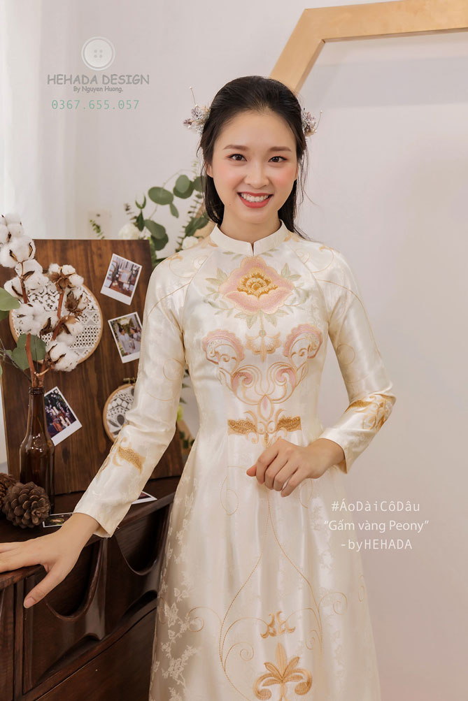 Gấm luôn là chất liệu an toàn cho những nàng dâu có body mảnh mai. Hiện nay, sức hot của Áo dài Gấm tại He được các nàng dâu chuộng phong cách truyền thống quan tâm rất nhiều.