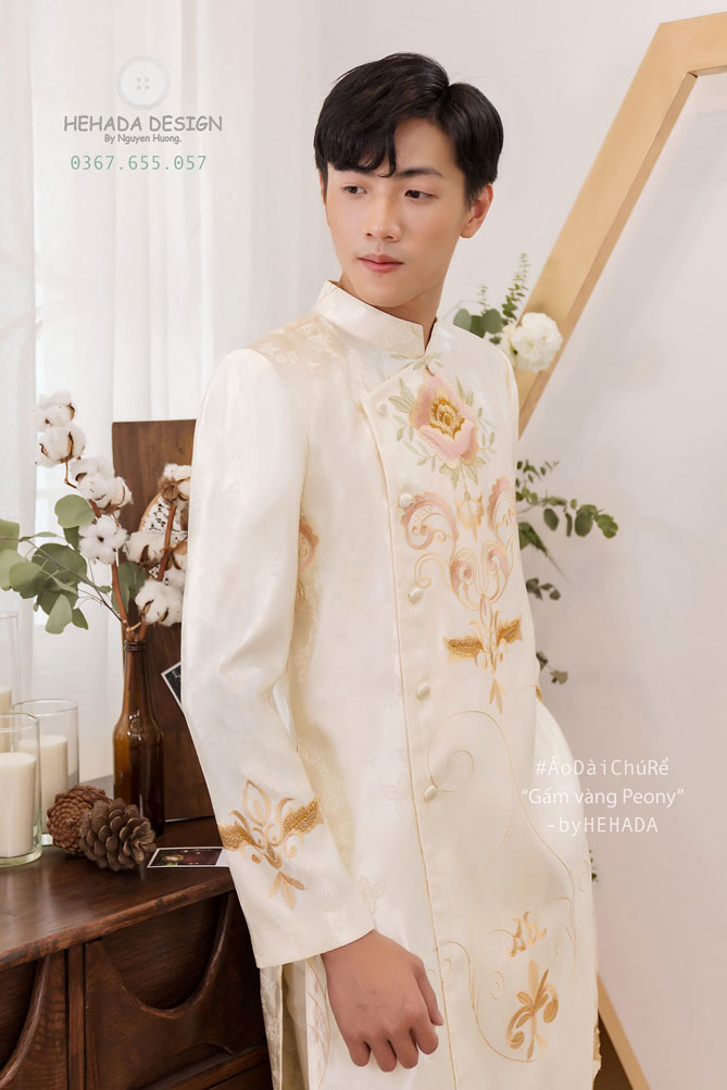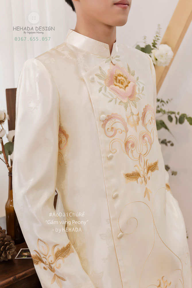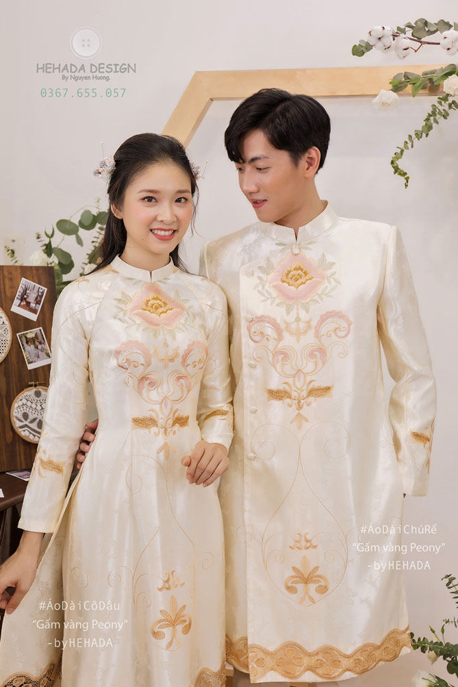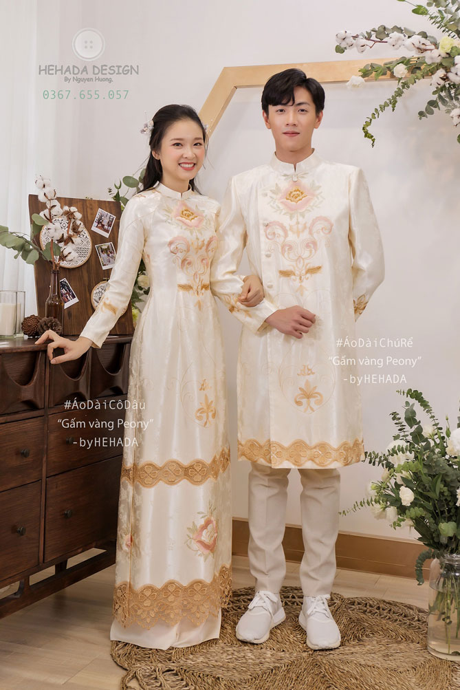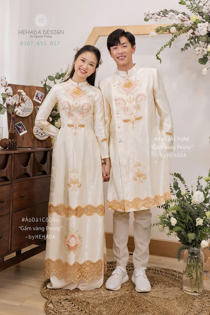 "Gấm Dệt Peony" nhà He với tone màu vàng kem ấm áp, nhẹ nhàng phù hợp cho những cặp đôi đang tìm mẫu cho lễ Đính Hôn/ Dạm Ngõ thân mật.
