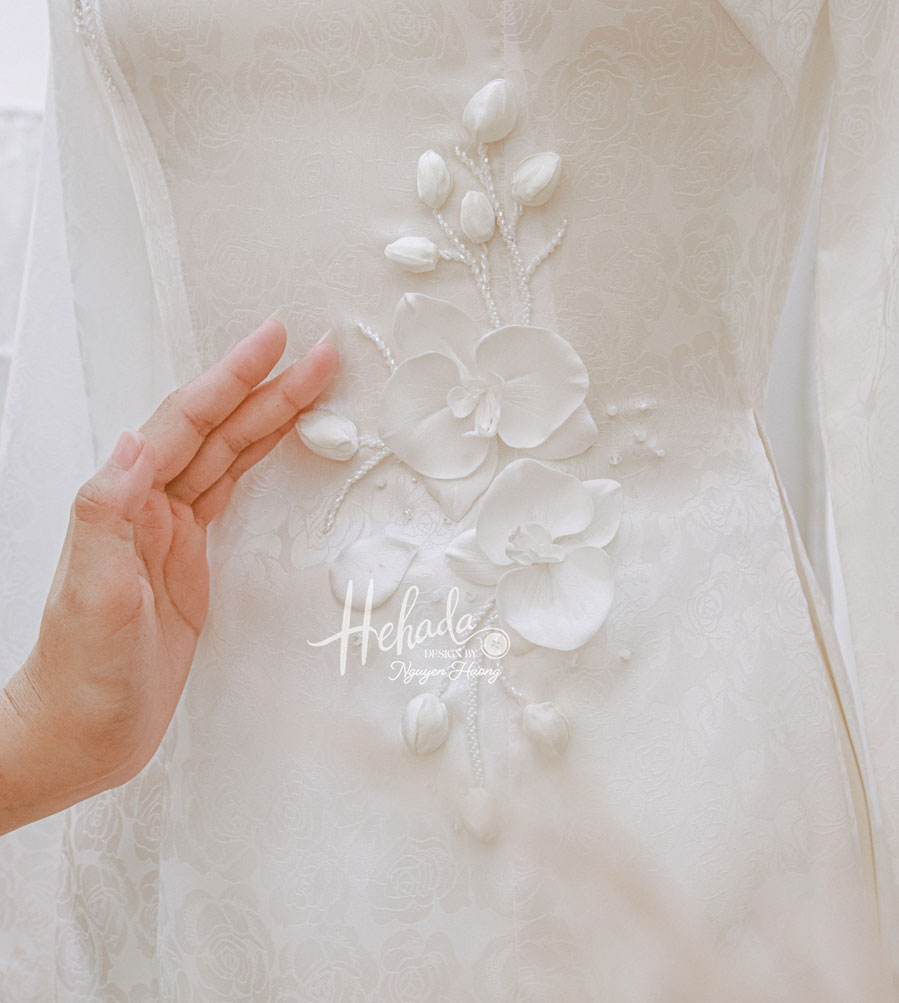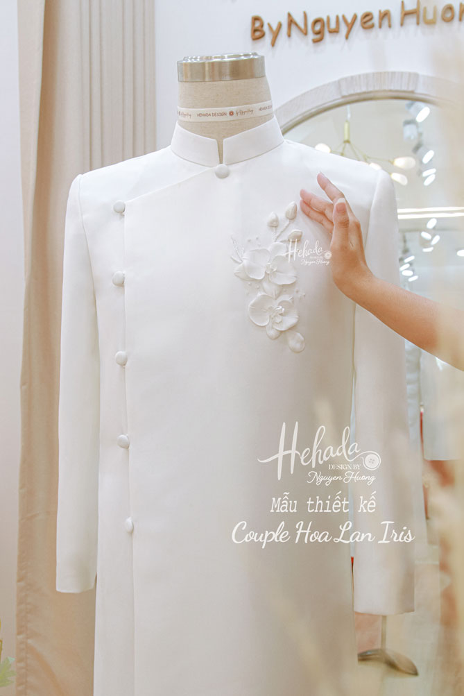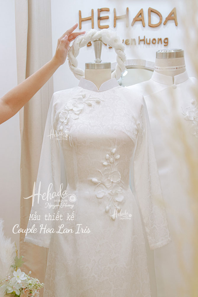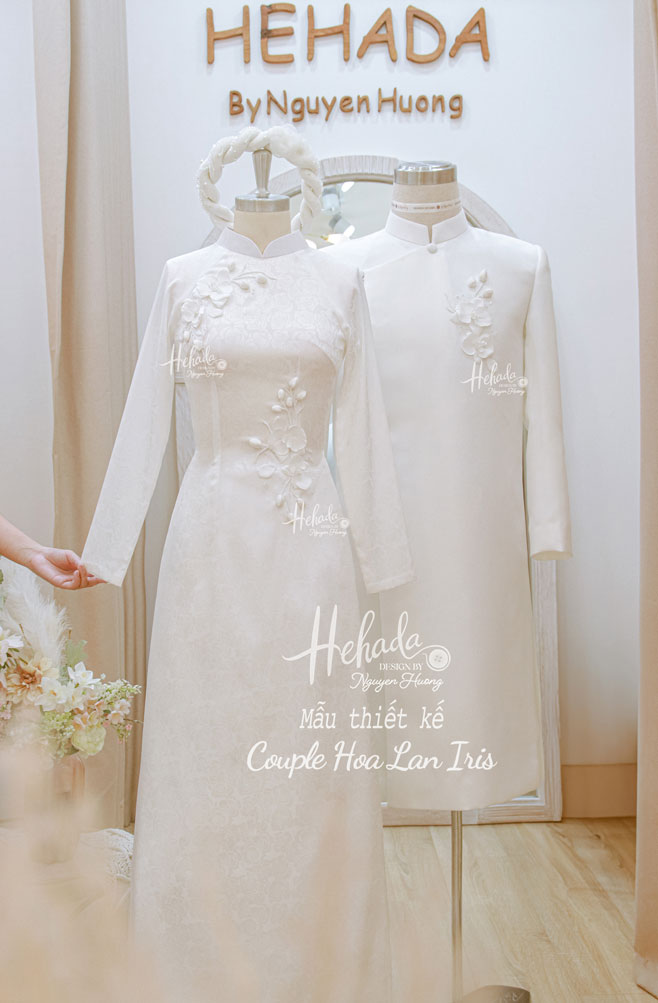 Lấy cảm hứng từ vẻ đẹp thanh cao của loài hoa Iris, He đã sáng tạo và thiết kế nên cặp áo dài 𝐇𝐨𝐚 𝐋𝐚𝐧 𝐈𝐫𝐢𝐬 với tone trắng thuần khiết, kết hợp những hạt pha lê lấp lánh cho Dâu & Rể cùng toả sáng trong ngày vui.