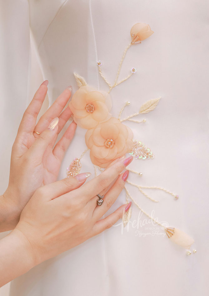 Satin-Camellia là một trong những mẫu Signature nhà He, với thiết kế hoa voan, bố cục rơi nhẹ trên tà áo tạo nên nét đài cát tiểu thư.