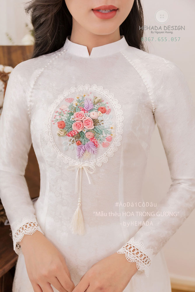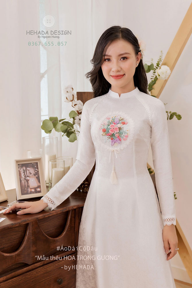 Chiếc gương là một món đồ kề cạnh chị em gái chúng mình từ thời xa xưa đến nay. Và cũng vì vậy mà He đã có ý tưởng cách điệu chiếc gương lên áo dài cưới cho các nàng í