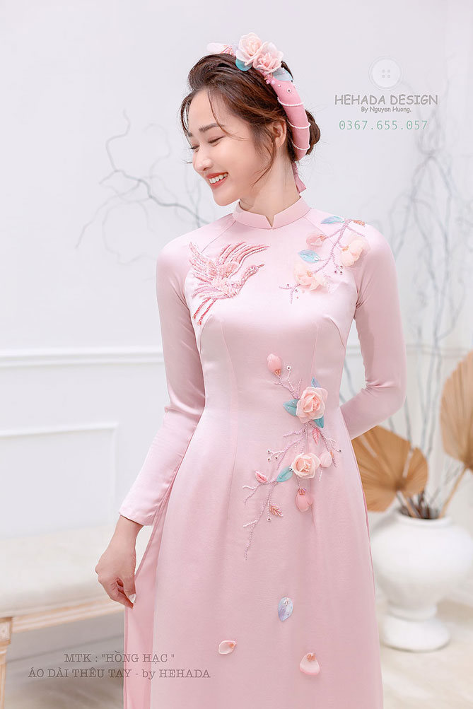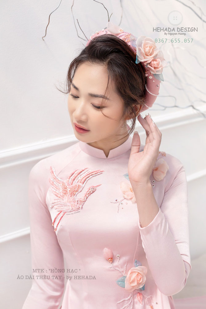 Thiết kế “Hồng Hạc” ấn tượng với chi tiết Chim Hạc được He chăm chút đính những viên đá pha lê lấp lánh, từng cánh hoa hồng loang màu vương trên nền lụa nhung cao cấp, mang nét yêu kiều cho nàng dâu mới.