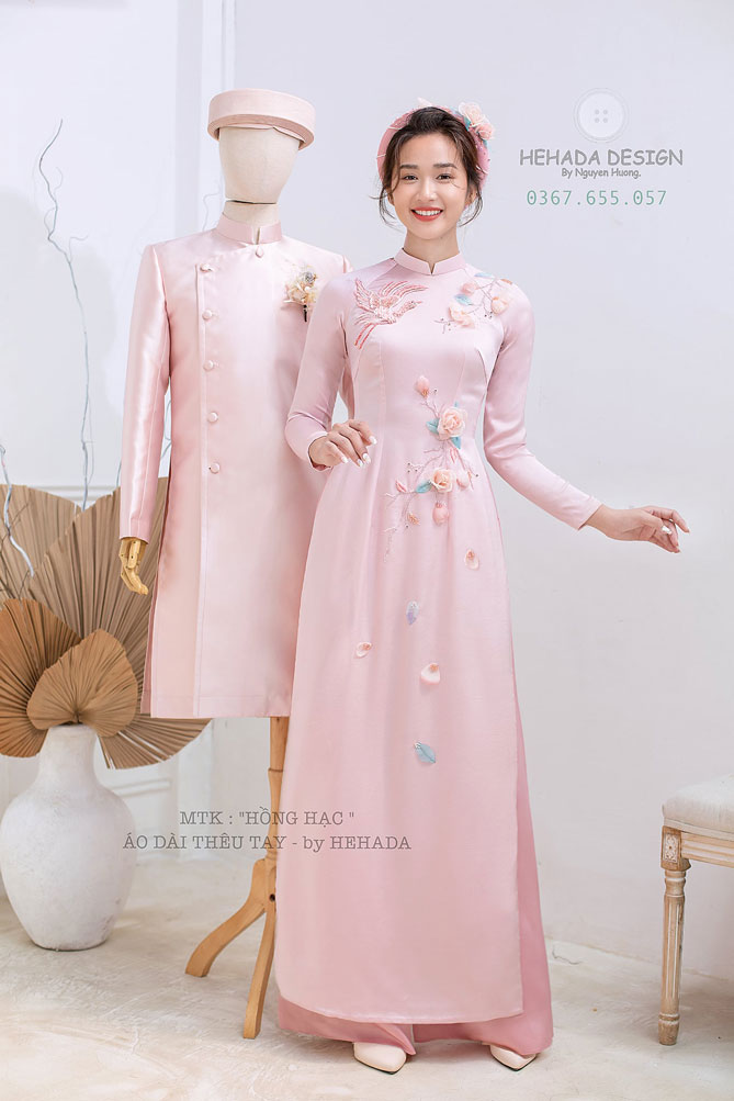 Áo Dài chú rể form vest lịch lãm có tone hồng pastel ngọt ngào cùng tone màu với Áo Dài cô dâu, dành cho các cặp đôi chuẩn bị Dạm Ngõ, Đính Hôn nè. He nghĩ rằng sẽ tuyệt vời hơn khi diện cả đôi nàng héng.