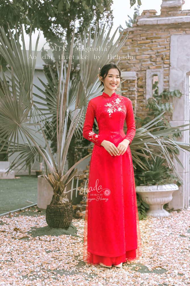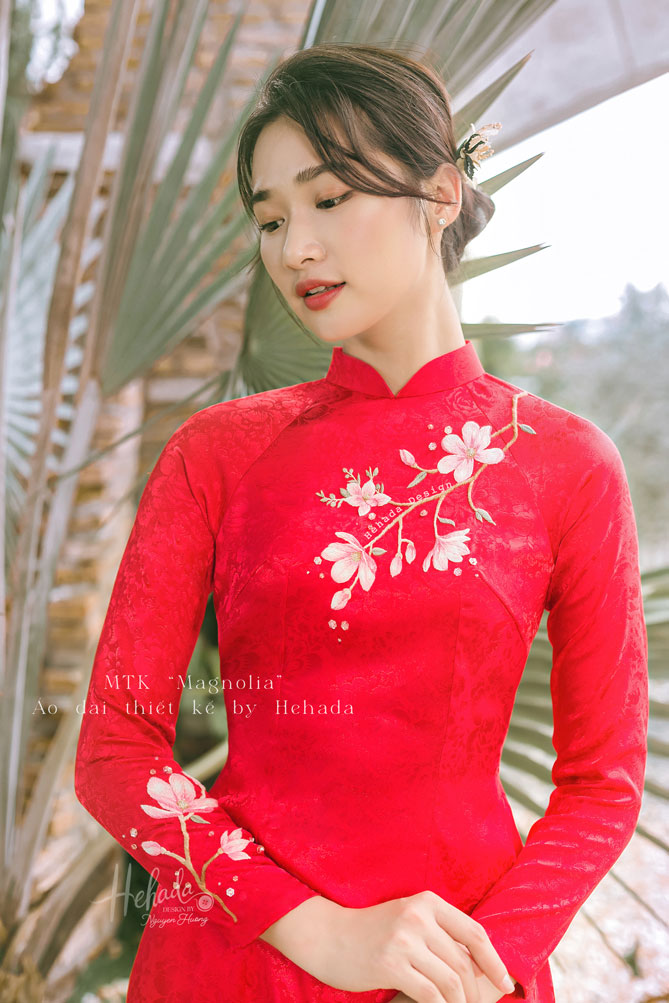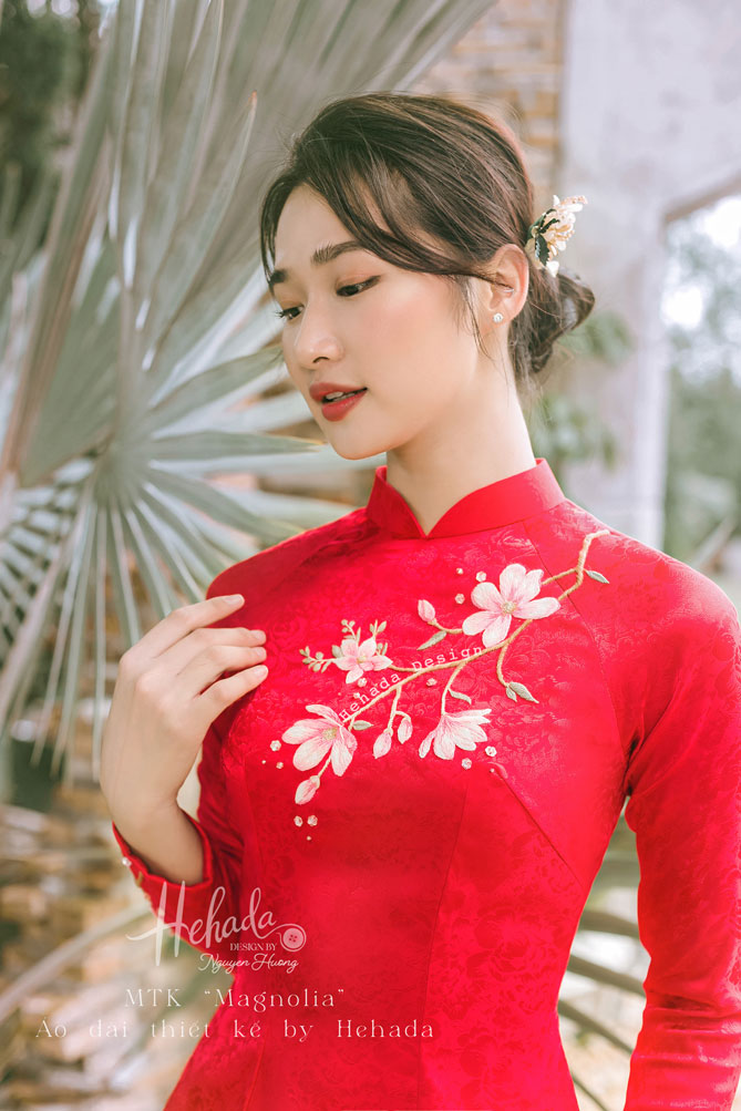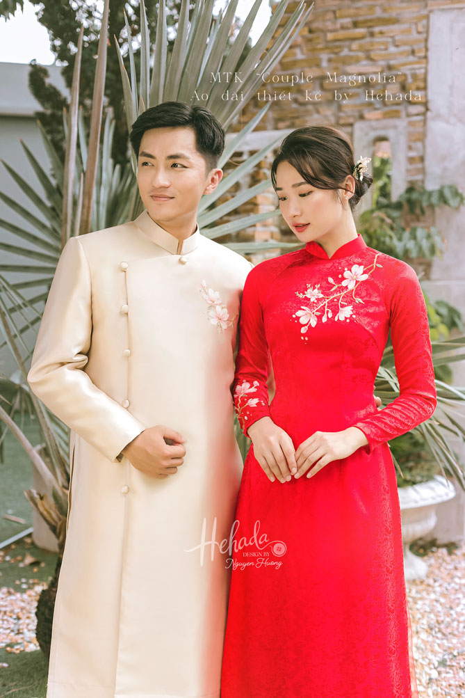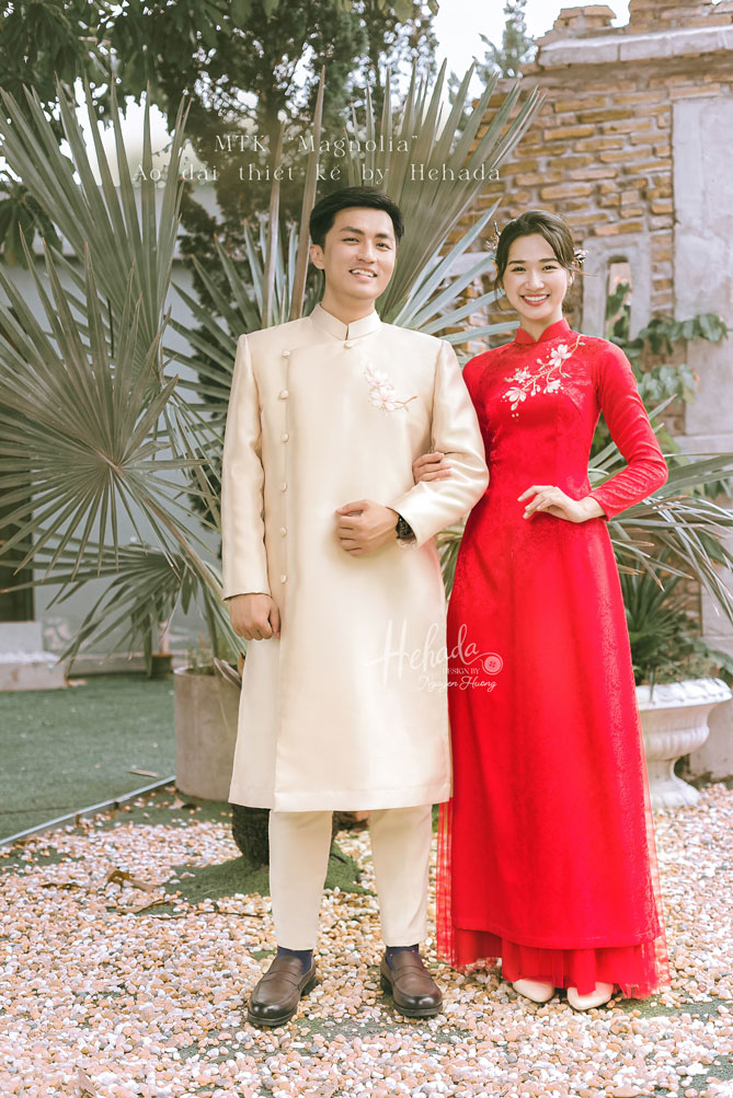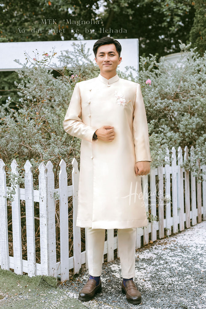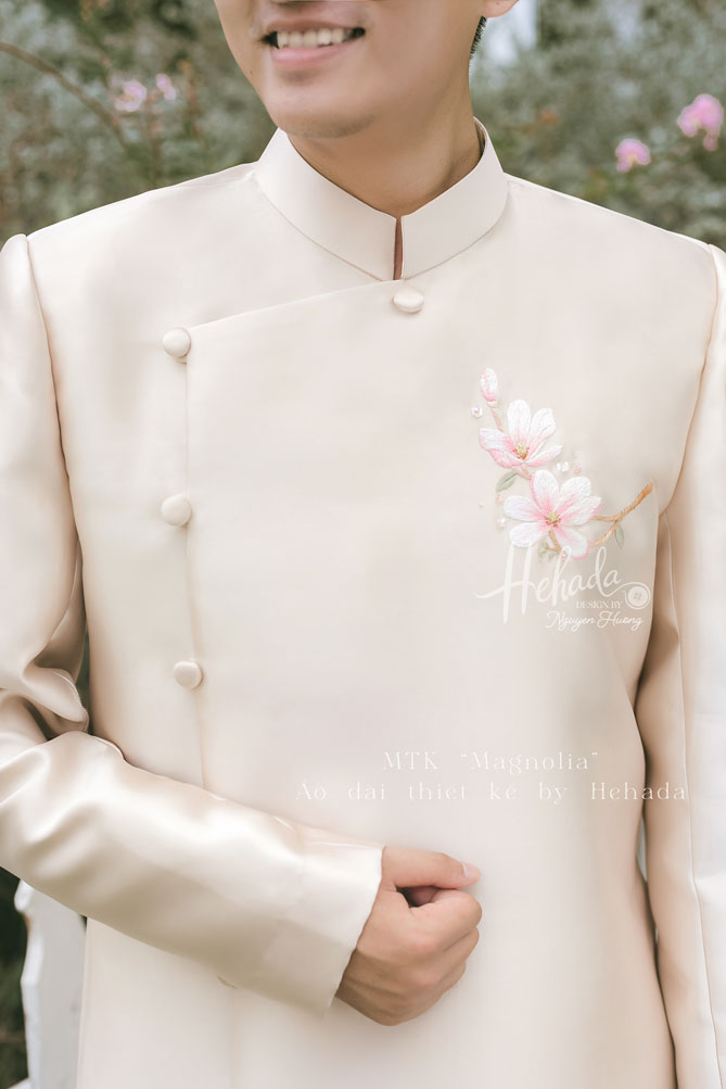 Áo dài cô dâu với bố cục mới hơn, He thiết kế nhánh mộc lan ở vai và tay, đặc biệt hơn cả, đẹp đôi cùng nàng là chàng Mộc Lan lịch thiệp, He thêu tả thực cụm hoa mộc lan trên nền lụa tông Ivory hiện đại.