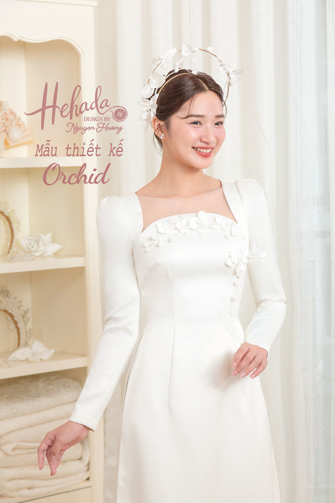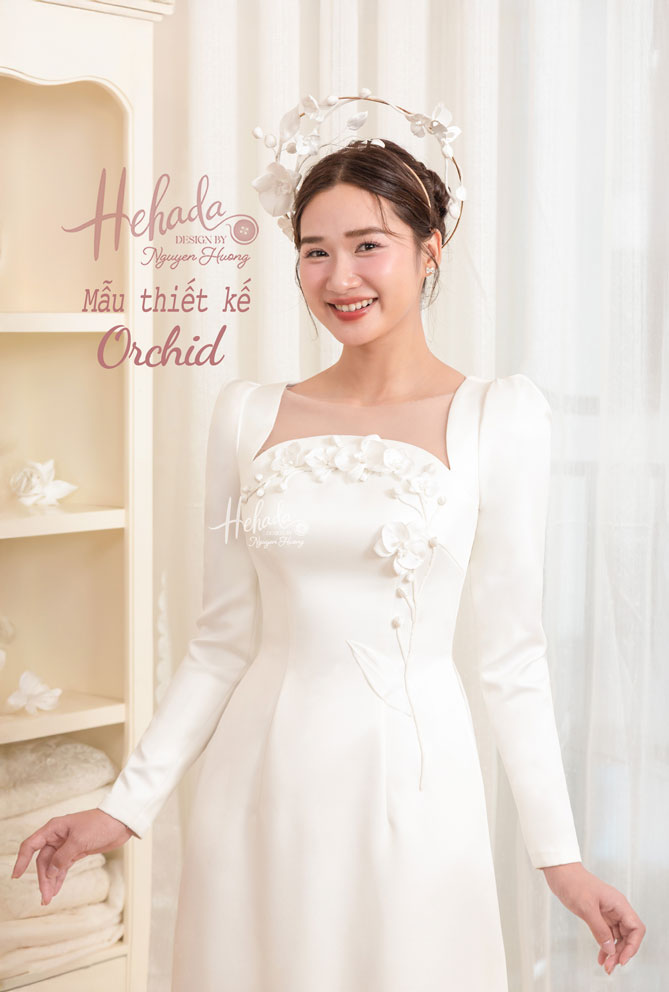 Áo dài Orchid nền nã với hoạ tiết hoa lan được He thiết kế 3D cùng bố cục trải vòng từ ngực eo vừa khéo léo che mọi khuyết điểm vừa tạo điểm nhấn nổi bật hài hoà.