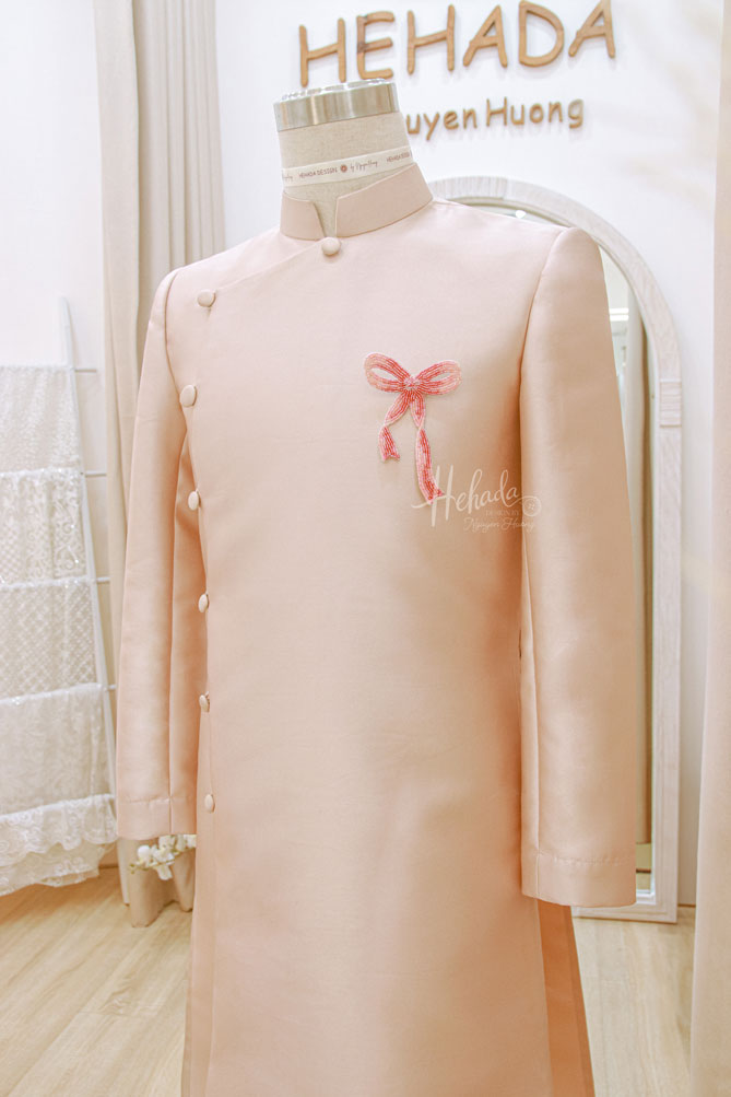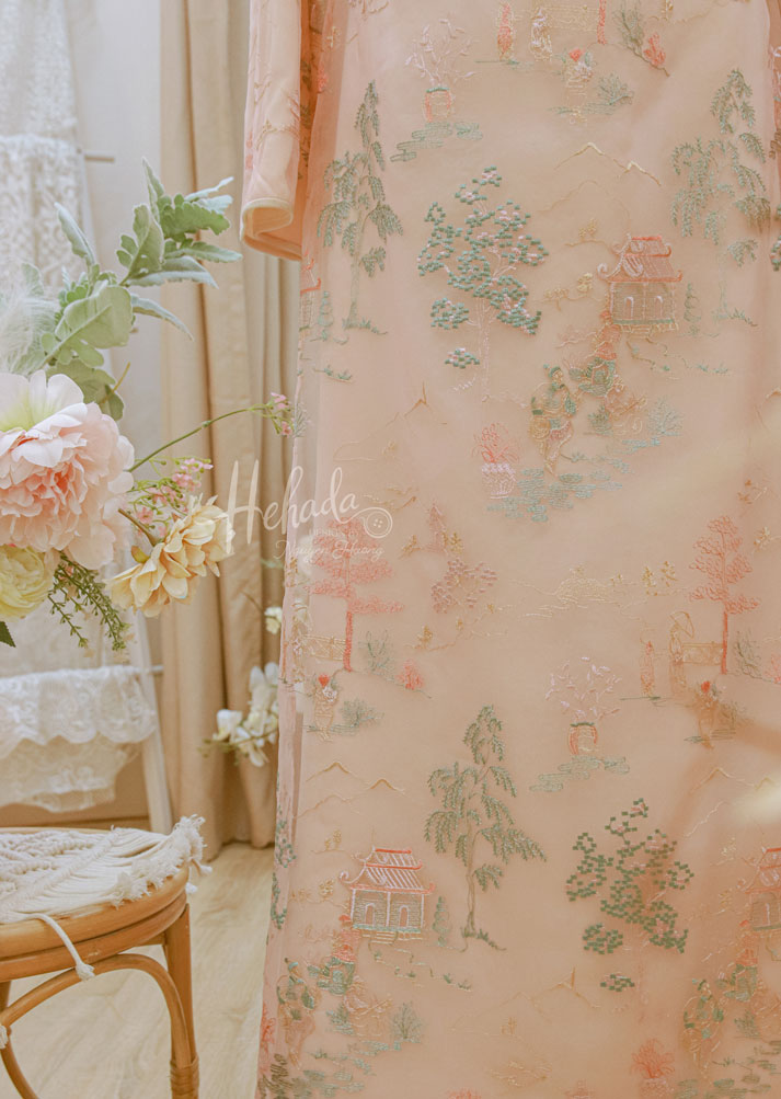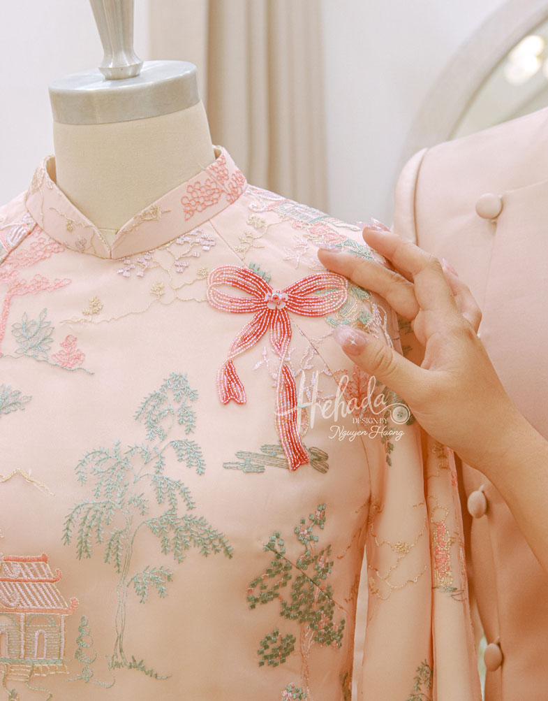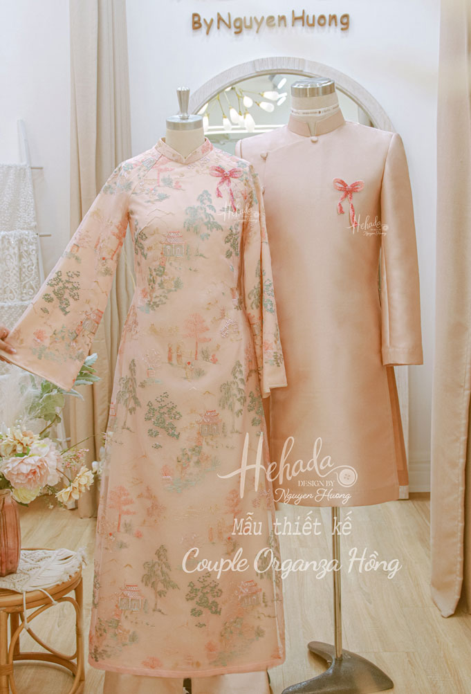 Áo dài Organza Tranh Thuỷ Mặc luôn nằm trong những mẫu áo dài suông được yêu thích tại He với tone hồng nude dịu dàng vừa tôn da vừa phù hợp để diện cho các lễ Dạm Ngõ, Gia Tiên hoặc sự kiện đặc biệt nà