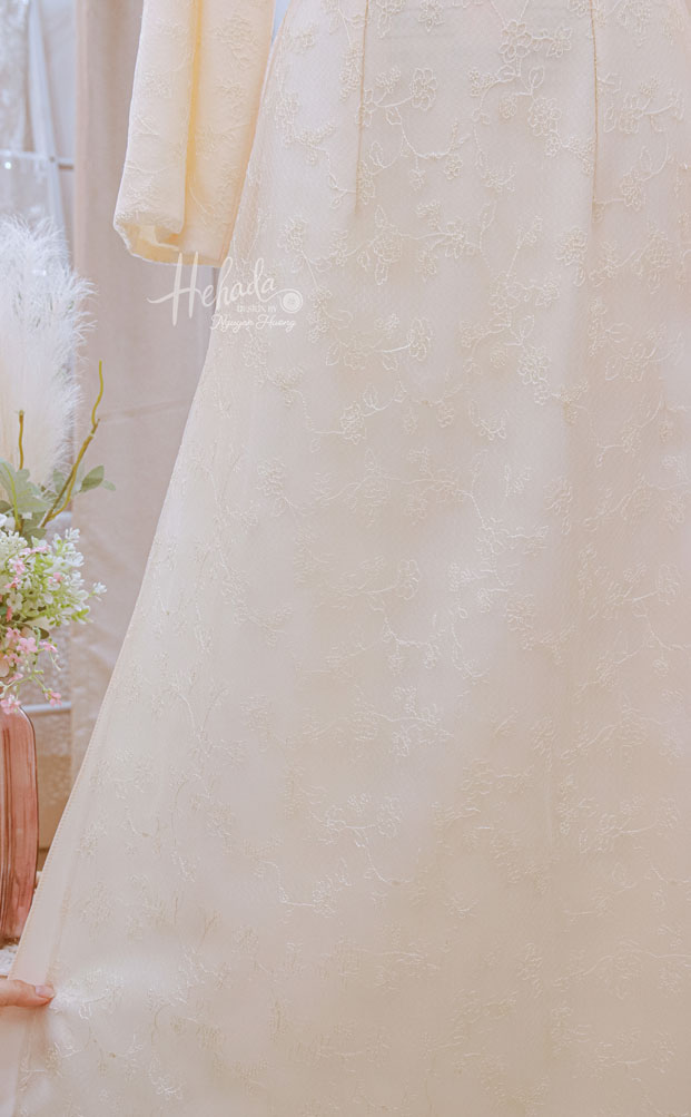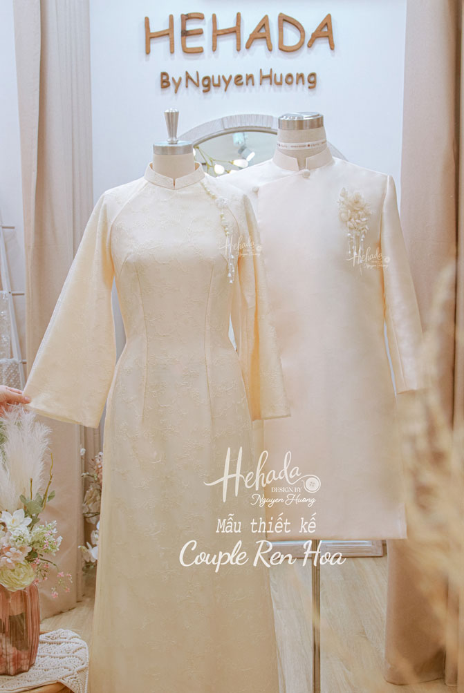 Thiết kế áo dài cô dâu với chất liệu ren hoa nhí cao cấp tạo hiệu ứng nhẹ nhàng mềm mại, form áo được thiết kế khéo léo hợp mọi dáng nàng dâu. Áo dài với tone kem dịu nhẹ tôn lên thần sắc của nàng, phần ngọc bội được He đính kết giúp dâu thêm phần duyên dáng và thanh lịch