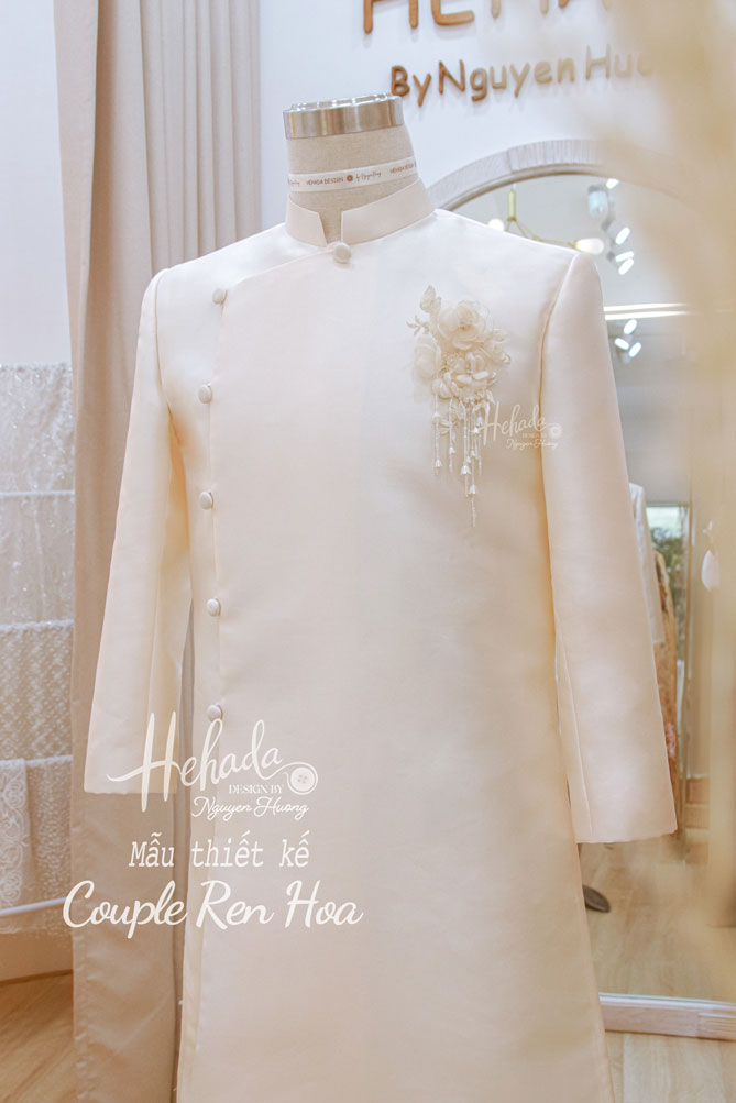 Áo dài chú rể được He phối đồng điệu cùng tone với áo dài cô dâu, phần ngực áo được He đính thêm cài áo cùng màu cho chàng thêm nổi bật trong ngày trọng đại