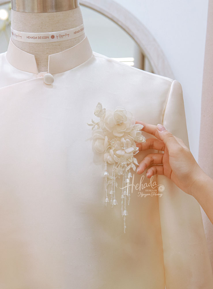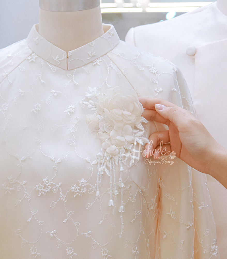 Thiết kế Ren Pháp Hoa Nhí lần này được He may đo theo ý tưởng của nàng dâu với chất liệu ren hoa nhí cao cấp tạo hiệu ứng nhẹ nhàng, mềm mại trên nền vải tone kem dịu nhẹ giúp tôn thêm thần sắc trọng và rạng rỡ cho nàng dâu.