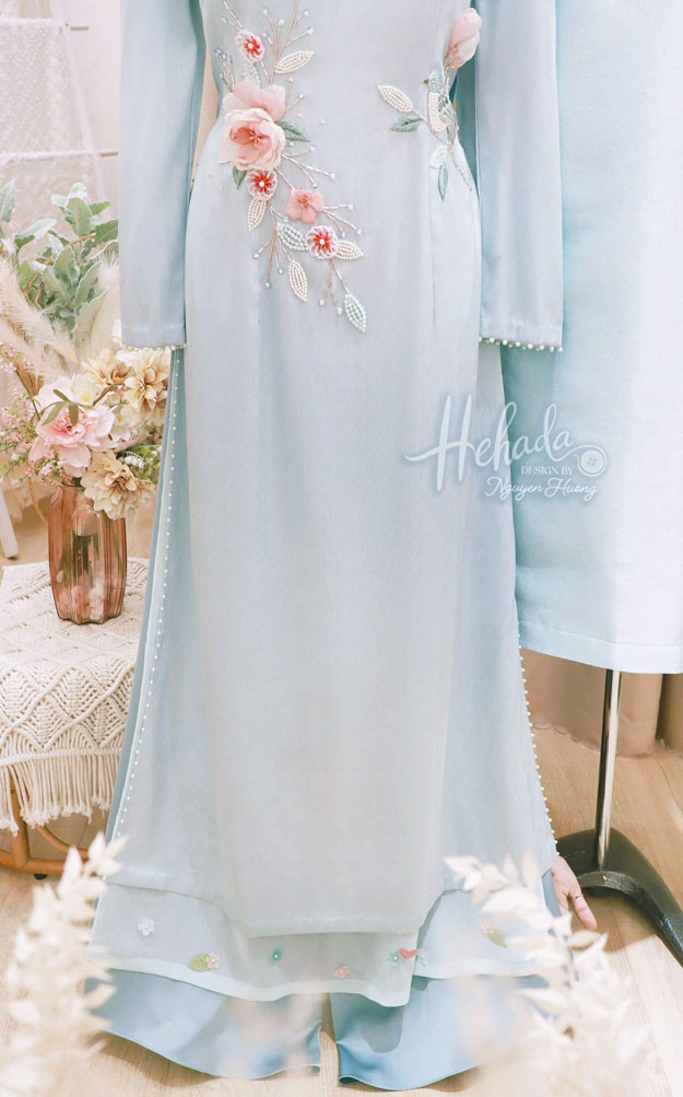 Couple "Sương Mai Xanh" trên nền vải lụa xanh pastel dịu mắt, từng cánh hoa được thêu tay tỉ mỉ, He còn điểm thêm ngọc trai và chỉ bạc tạo điểm nổi bật tăng thêm sự lãng mạn và ý nghĩa nà