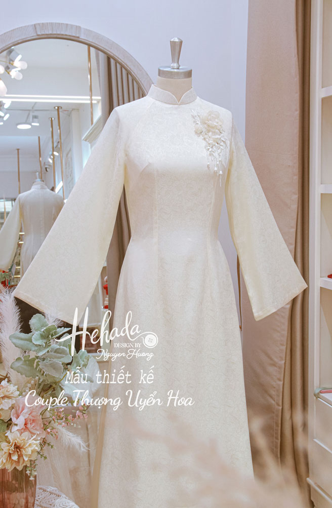 Thiết kế áo dài với dáng cổ truyền thống cùng form suông nhẹ giúp nàng dễ di chuyển, tôn dáng mà không gò bó, phù hợp với mọi dáng dâu. Thiết kế phần tay áo loe nhẹ nhàng thanh thoát tạo nét trẻ trung và không quá truyền thống. Từng chi tiết hoa ẩn hiện trên mặt gấm như lời chúc phúc cho khởi đầu hạnh phúc của đôi lứa