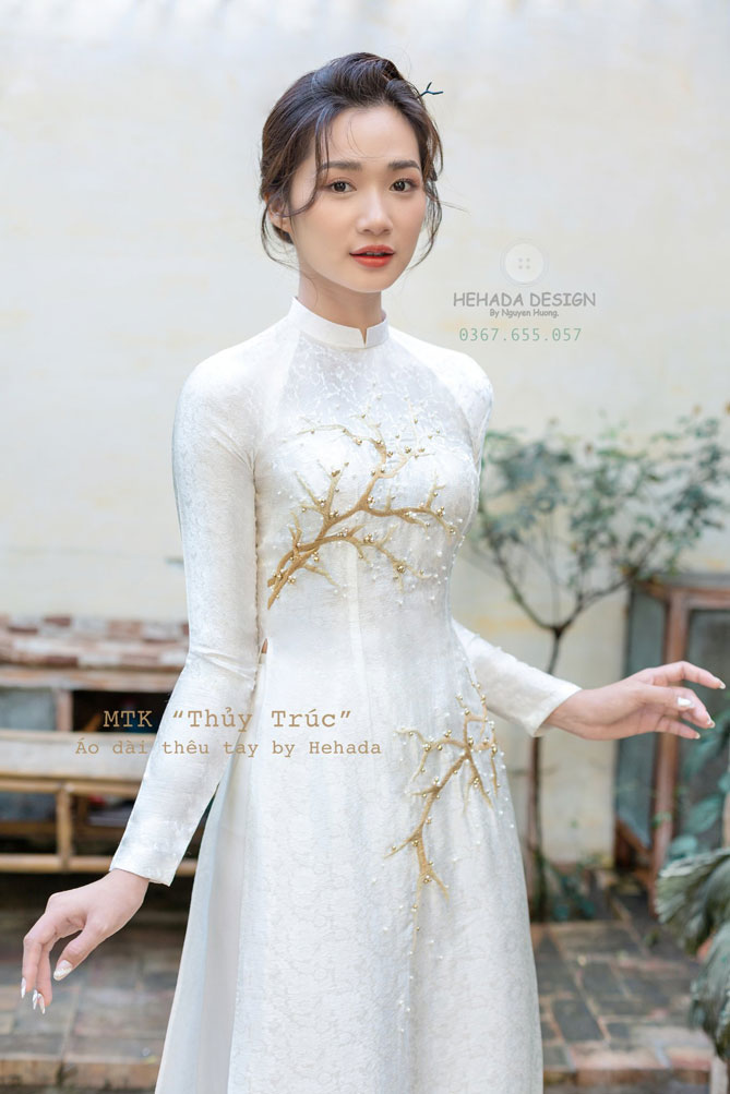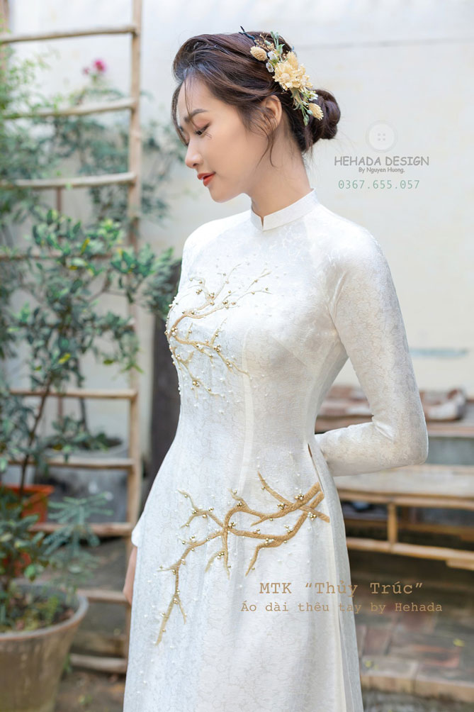Thiết kế áo dài “Couple Thuỷ Trúc” được He restock với phiên bản Thuỷ Trúc trên nền lụa tơ tằm trắng.