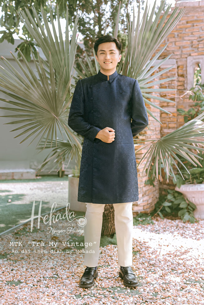 Áo dài nam đĩnh đạc với chất liệu Gấm Nhật, tone màu xanh “Dust navy” vừa truyền thống vừa lịch lãm.
