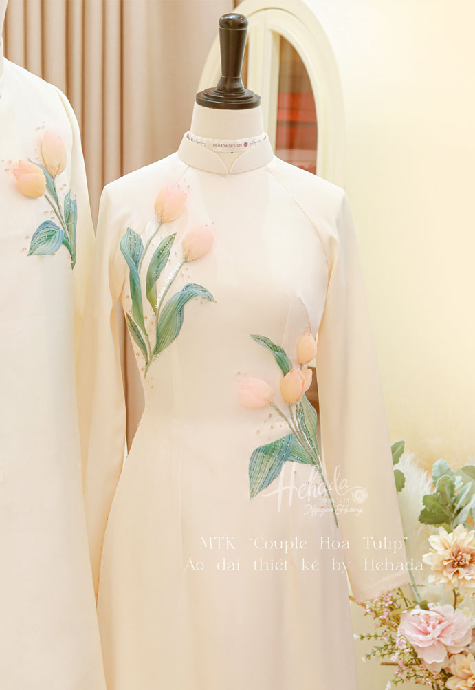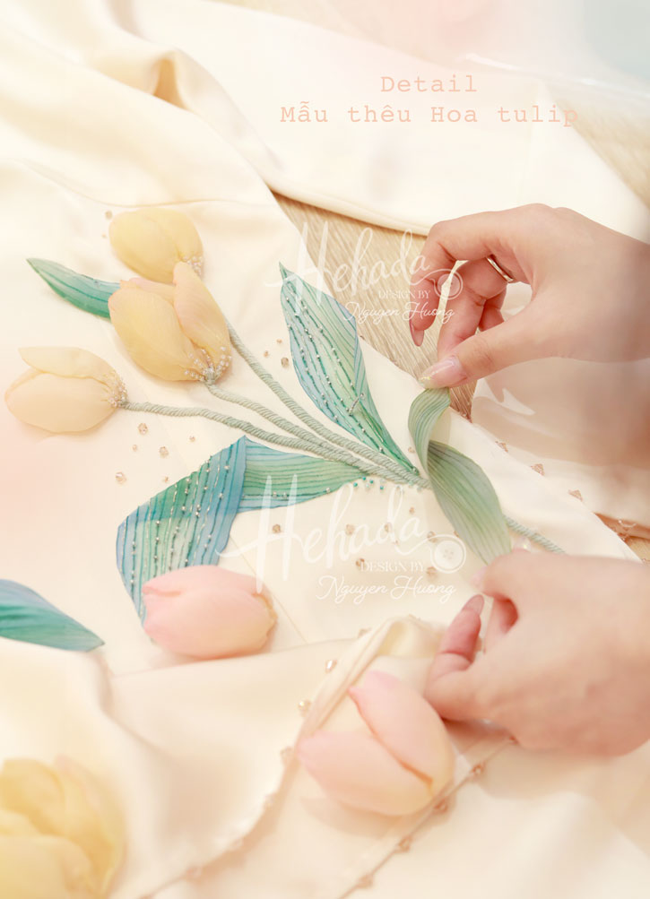 Vẻ đẹp tinh tế và chân thật của đoá hoa Tulip đã được He lột tả “như một đoá hoa tươi” qua chất liệu voan cao cấp, với thủ thuật xử lý nhuộm loang chuyên nghiệp.