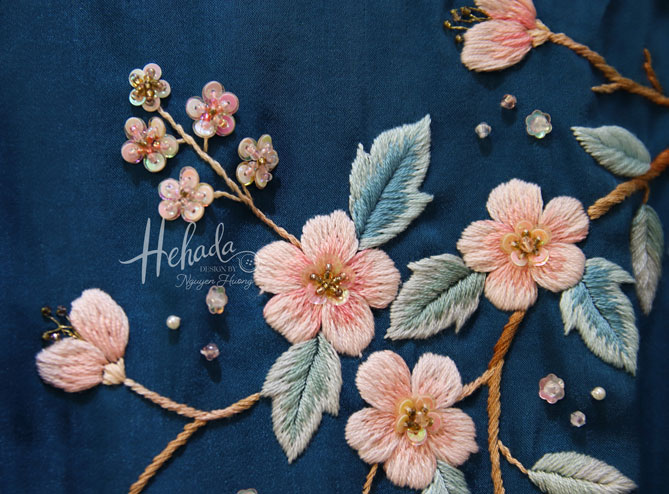 Áo dài ''Hoạ Tiết Hoa Đào" như một bức tranh mùa xuân tươi mới với hoạ tiết cành hoa đào được thêu tỉ mỉ, dọc phần tà được điểm xuyến thêm những cành đào nhỏ mang đến sự hài hoà và sống động
