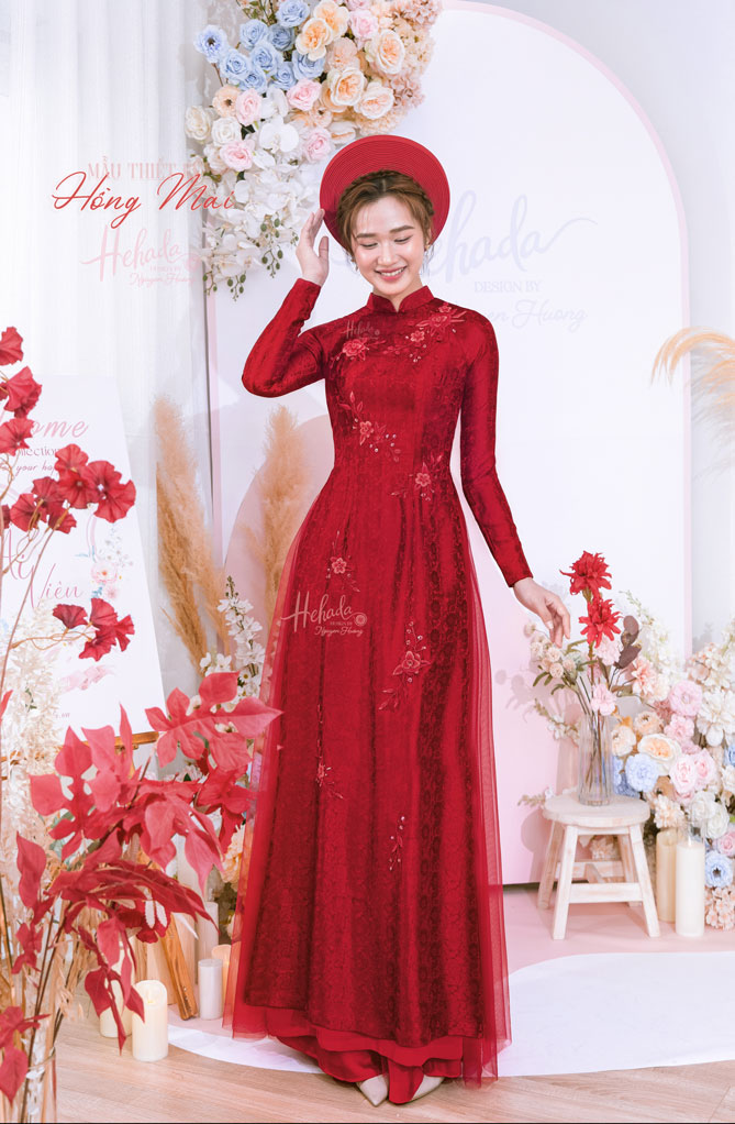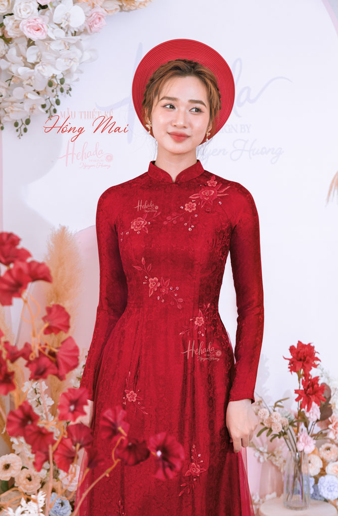 Hồng Mai- Mẫu Áo Dài Cưới Lụa Đỏ