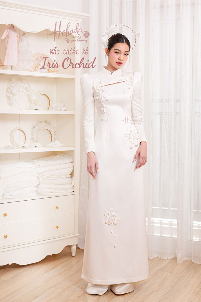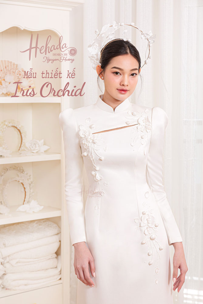 Áo dài với phần vai được thiết kế phồng nhẹ giúp tổng thể thanh thoát và tôn dáng hơn. Iris Orchid với phần cổ truyền thống cùng đường cắt chéo nhẹ ở phần ngực vừa kín đáo vừa đủ khác biệt