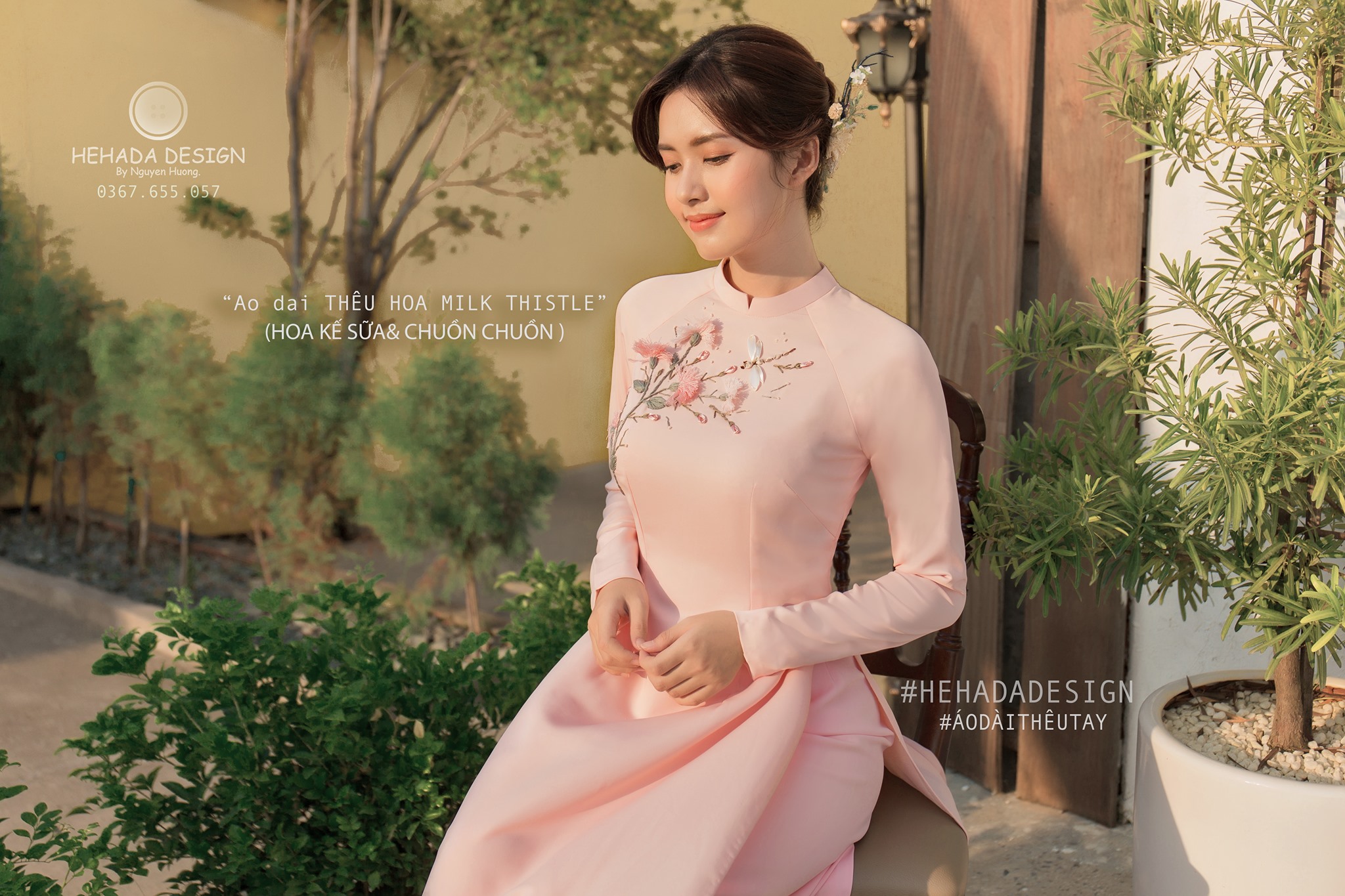 Trên nền lụa mịn màu hồng pastel ( hồng dâu nhạt ) tạo nên nét dịu dàng nền nã cho nàng dâu, áo dài "Milk Thistle" với cụm hoa tạo điểm nhấn trước ngực, mũi thêu tinh tế chắc hẳn nàng sẽ yêu bông hoa ngay khi ướm thử em í ạ.