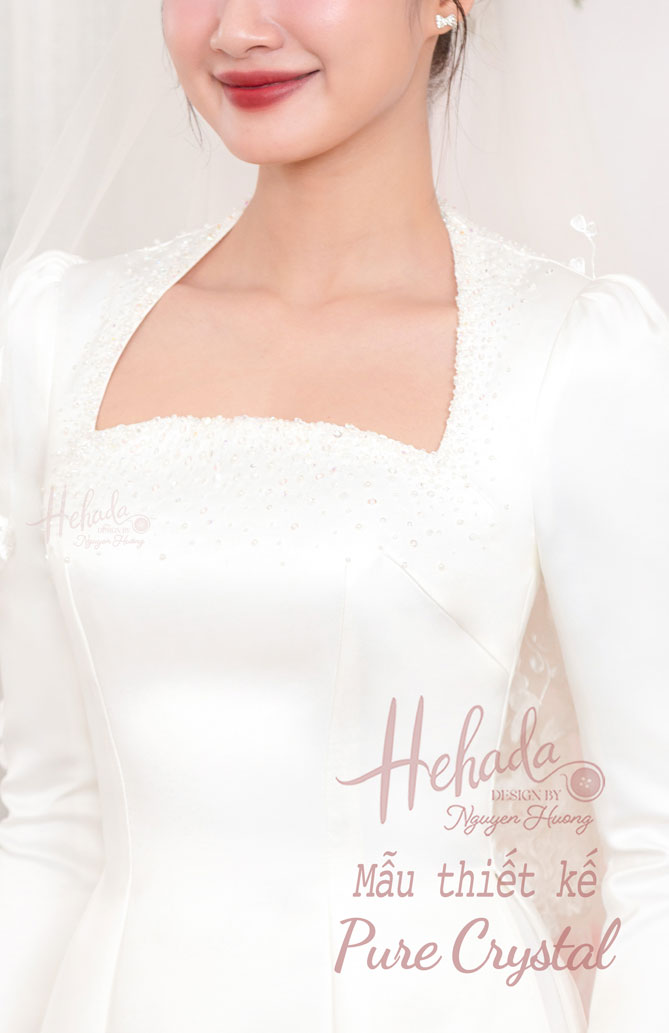 Điểm nhấn của “Pure Crystal” nằm ở form cổ vuông mềm mại, được xử lý khéo léo để tôn phần cổ và bờ vai, mang lại cảm giác thanh thoát và nữ tính. Phần cổ được đính kết pha lê tinh xảo, tạo hiệu ứng lấp lánh, giúp tổng thể trở nên sang trọng