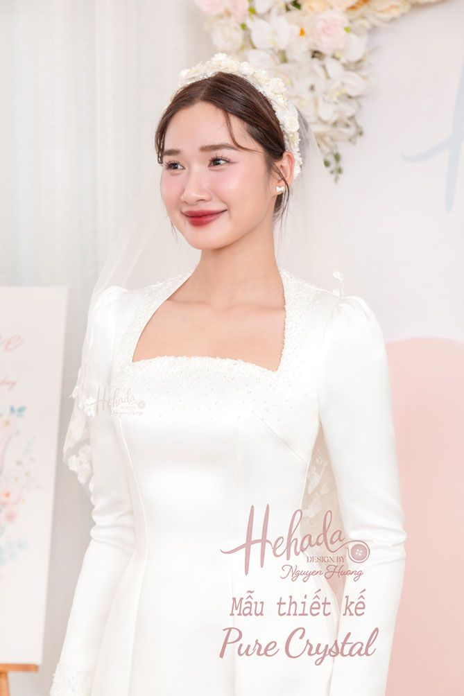 Phần tay áo ôm nhẹ, kết hợp chi tiết hoa đính nổi thủ công phần tay áo, tạo nên nét duyên dáng, mong manh cho nàng dâu. Mỗi chi tiết được He thiết kế kỹ lưỡng để khi nàng di chuyển, dáng áo vẫn giữ được sự mềm mại và hài hoà