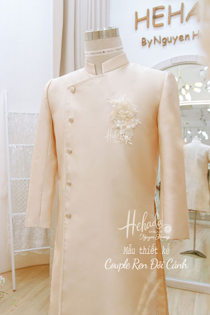 Thiết kế áo dài " Ren Hoạ Tiết Đôi Cánh" với gam màu nude, hoạ tiết ren đối xứng chạy dọc theo thân áo, phối với dây ngọc bội thiết kế cài trên áo thêm nét duyên dáng xinh yêu cho nàng