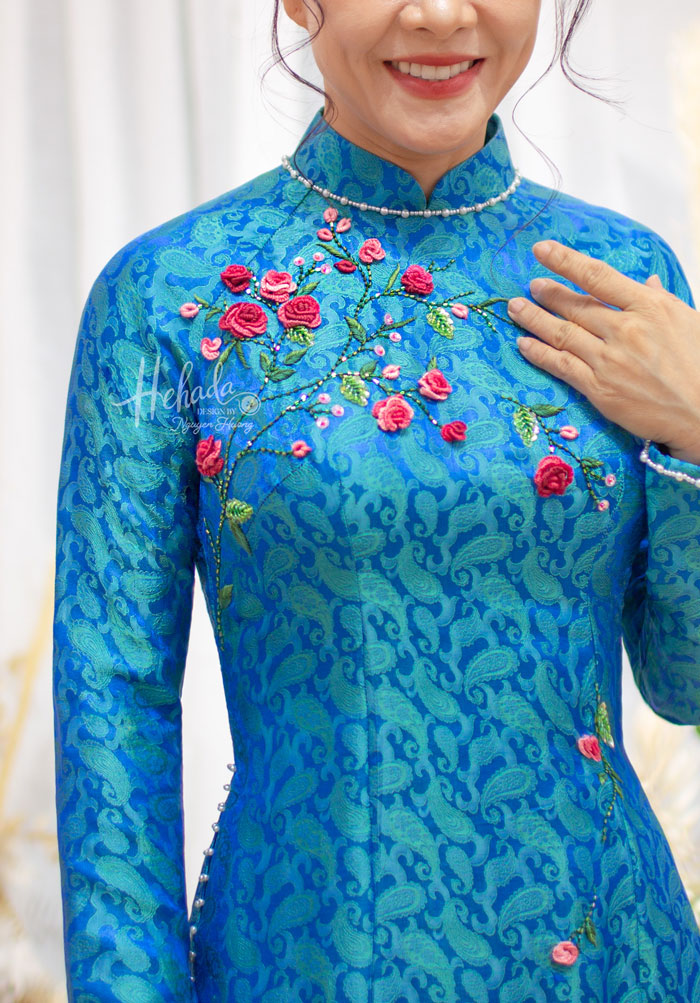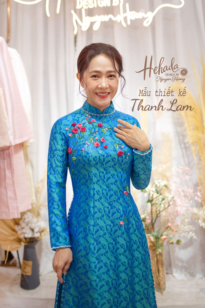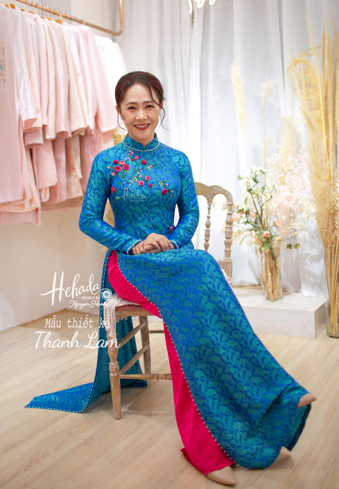 Áo dài “𝐓𝐡𝐚𝐧𝐡 𝐋𝐚𝐦” trên nền vải lụa tơ tằm mềm mại với gam màu xanh lam nền nã, thanh lịch. Những đoá hoa Rosalita xinh xắn được He thêu đính tinh tế trên phần ngực áo mang đến vẻ đẹp đầy sang trọng và quý phái