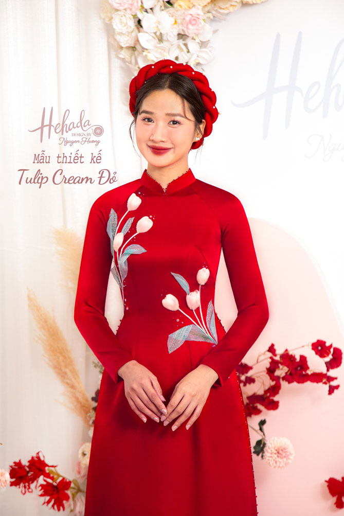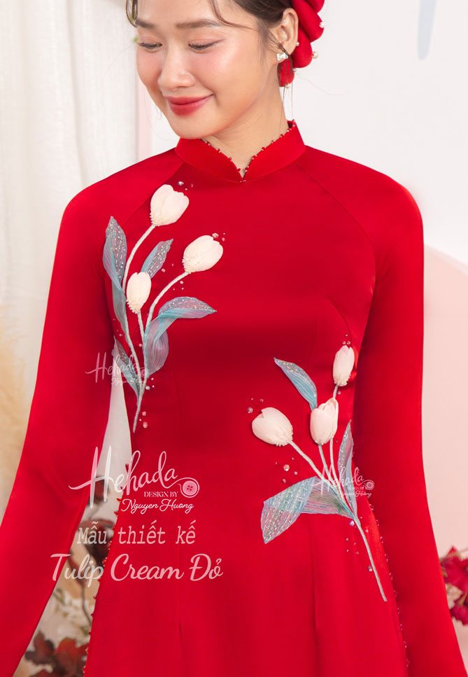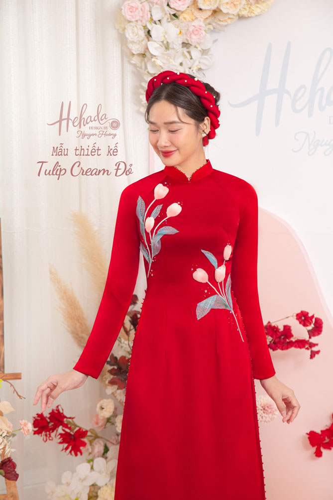 Nay He phối trên nền lụa đỏ trendy cho nàng có thêm option để tham khảo nà. Khác với tone kem nhẹ nhàng trước đó thì những đoá hoa Tulip khi phối trên nền đỏ lại trở thành điểm sáng nổi bật, từng hoạ tiết được thêu đính tỉ mỉ tạo hiệu ứng mềm mại nhưng vẫn sang trọng