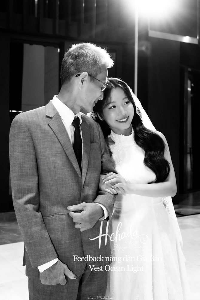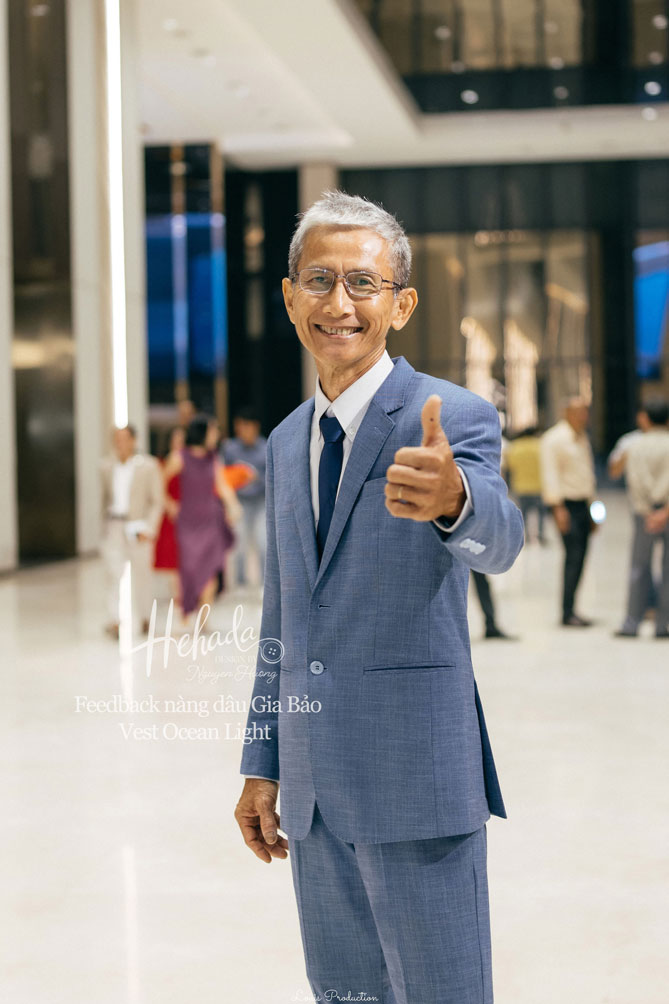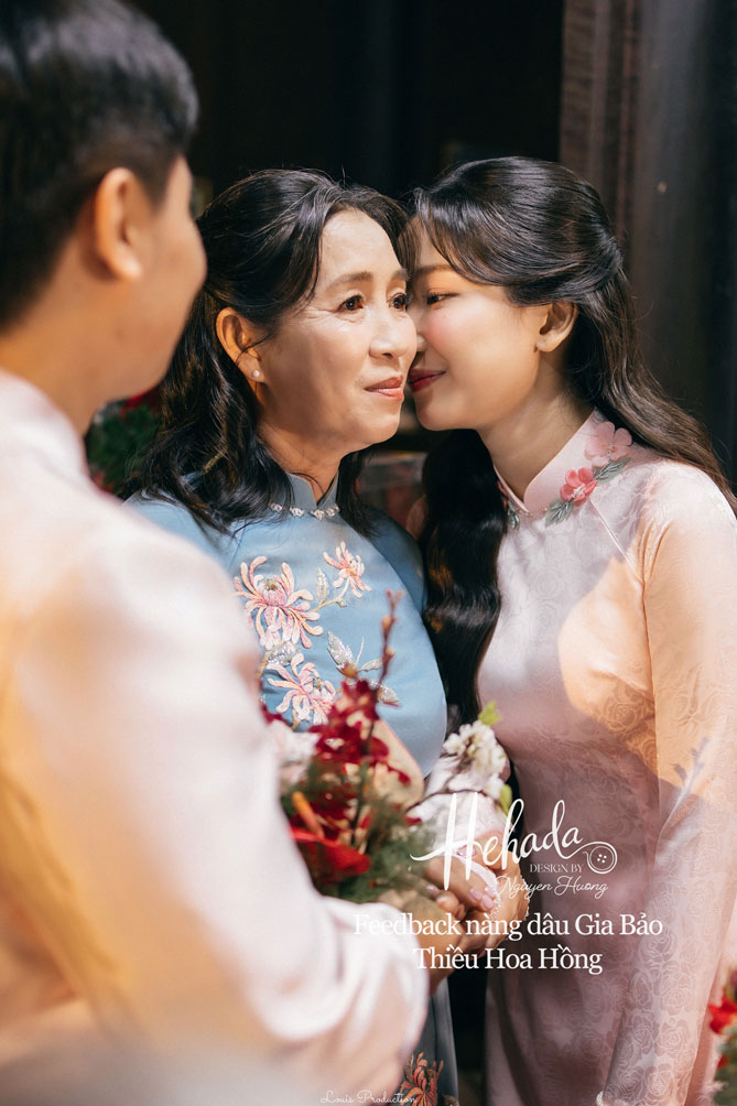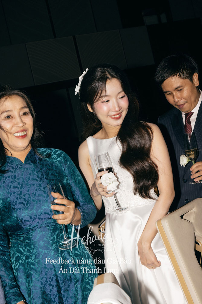 Khi đến He thử mẫu thì nàng đã ưng những thiết kế sui gia nhà He nên đã chọn thêm áo dài bà sui và vest cho bố mẹ. Mẹ nàng chọn diện thiết kế Cúc Đại Đoá và Thanh Lam nhà He cho Lễ Gia Tiên và tiệc cưới chính, tạo nên sự đồng điệu nhẹ nhàng, gắn kết trong từng khoảnh khắc của ngày vui. Bố nàng trong bộ vest Ocean Light chỉn chu, mang đến cảm giác vững chãi, để ngày trọng đại thêm tròn đầy trong không khí ấm áp của đại gia đình