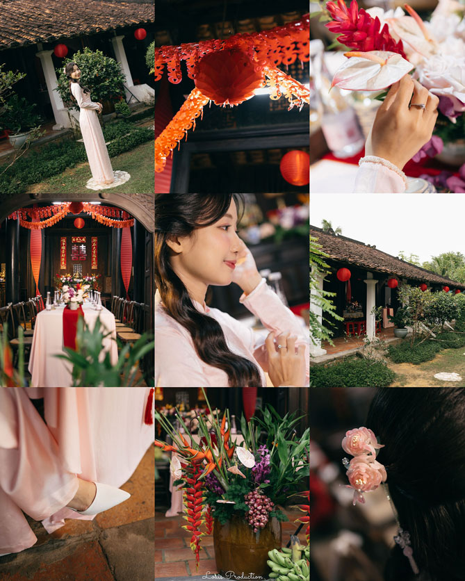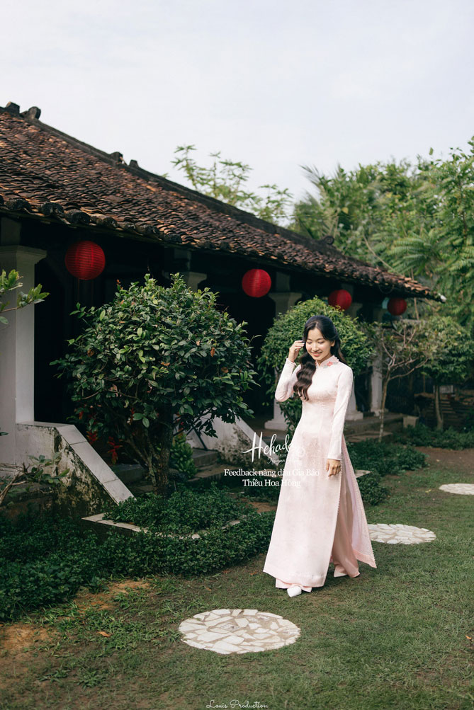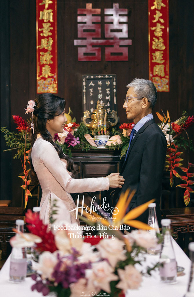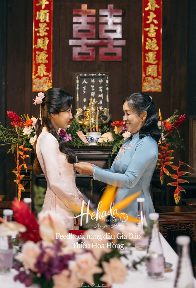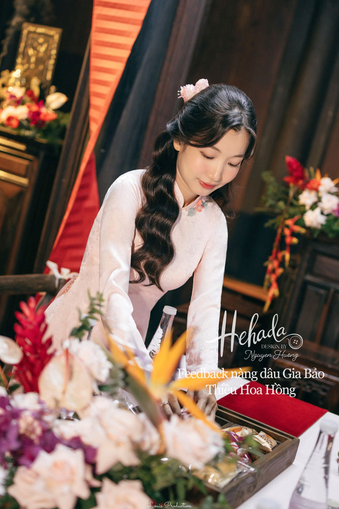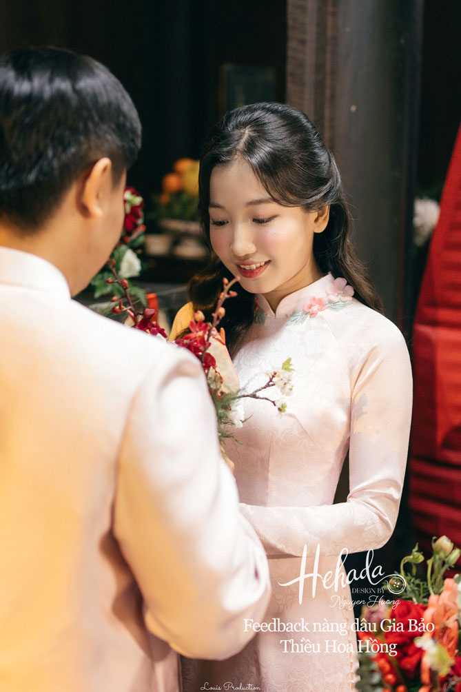 Nàng dâu Gia Bảo với gu nhẹ nhàng, tinh tế đến với He với mong muốn tìm một thiết kế áo dài mang đậm nét truyền thống, hài hoà cùng không gian Gia Tiên hoài cổ của gia đình. Dâu đã chọn cho mình thiết kế Thiều Hoa với tone hồng pastel nhẹ nhàng, cùng áo chú rể đồng điệu với áo dâu, tạo nên tổng thể hài hoà trọn vẹn với không gian tư gia mang đậm nét xưa với sắc gỗ trầm ấm cúng, mâm lễ đỏ thắm đậm chất Việt