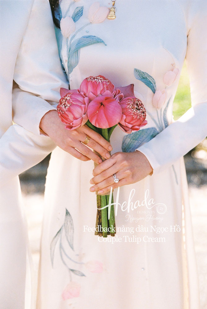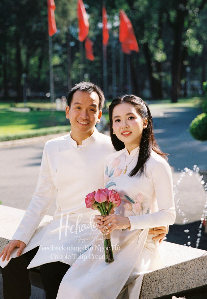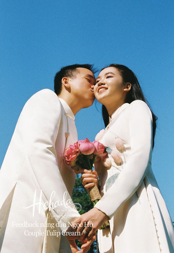 Tà áo dài của Nàng và Chàng với tone kem nhẹ nhàng cùng họa tiết hoa Tulip được điểm nổi bật hài hoà làm tăng thêm sự ngọt ngào và đầy ý nghĩa cho cả hai.