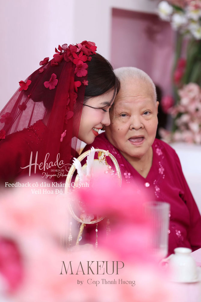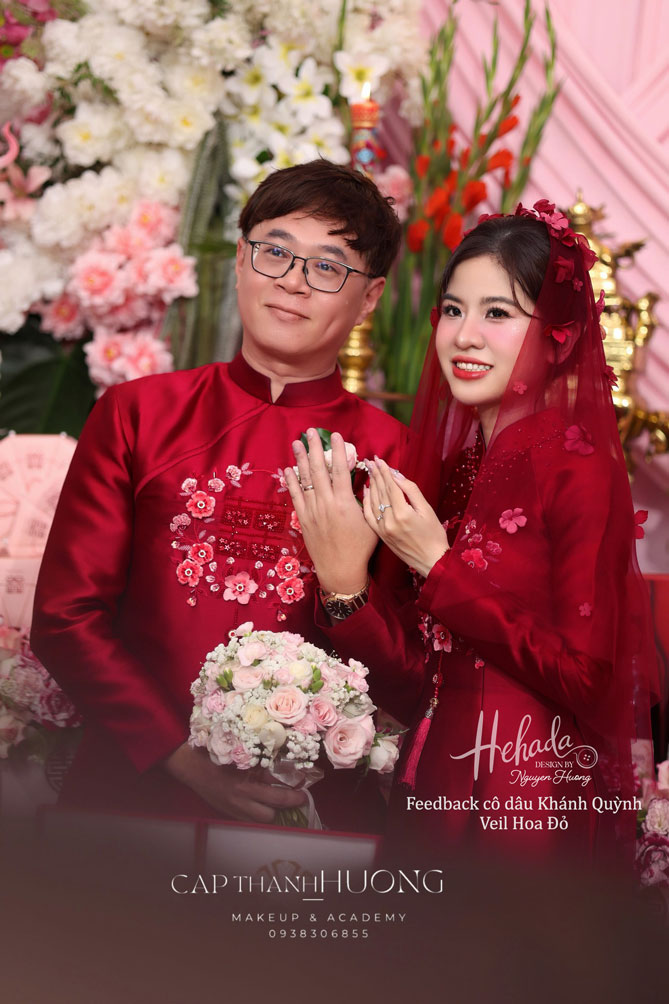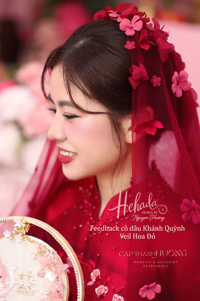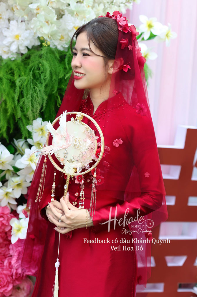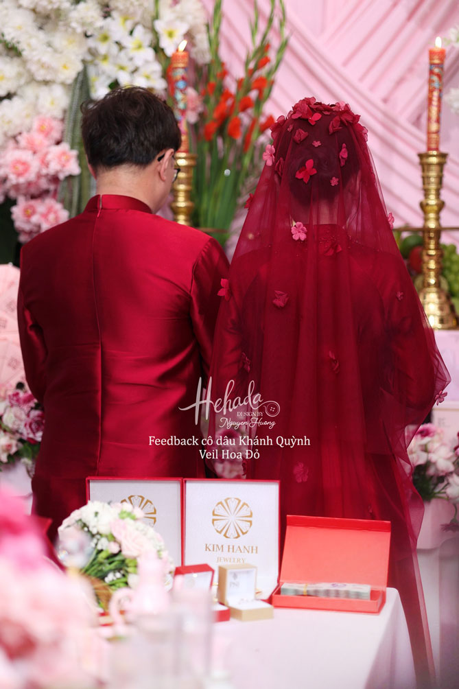 Một chiếc veil nhỏ xinh, cùng tone đỏ đồng điệu với tà áo dài cưới, được đính kết tỉ mỉ từng cánh hoa rực rỡ – chính là điểm chạm nhẹ nhàng giúp nàng thêm phần rạng rỡ, yêu kiều trong ngày trọng đại.