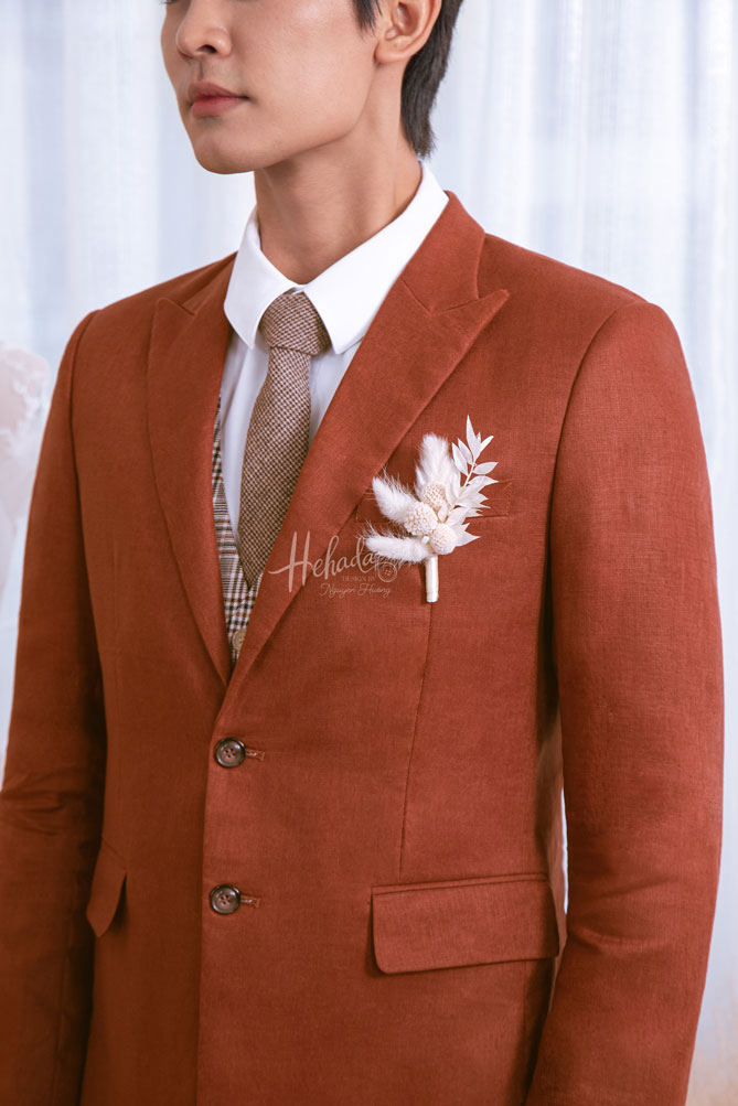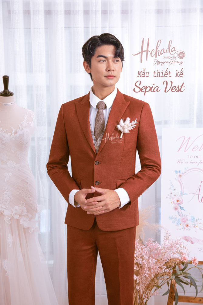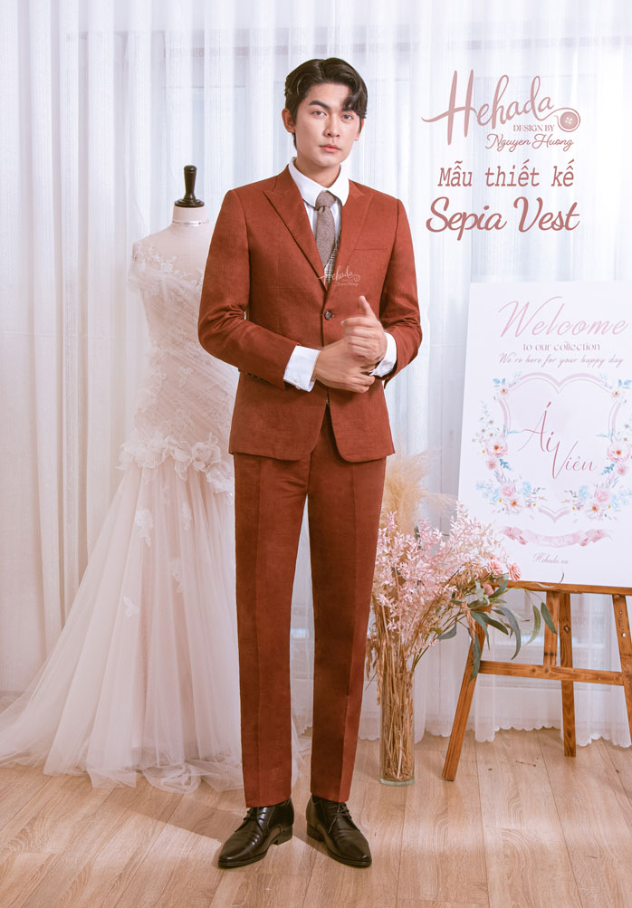 ”𝐕𝐞𝐬𝐭 𝐒𝐞𝐩𝐢𝐚” mang sắc cam pha nâu sậm ấm áp, vừa mạnh mẽ vừa tinh tế, giúp chú rể nổi bật nhưng vẫn giữ được nét nhã nhặn trong ngày trọng đại.